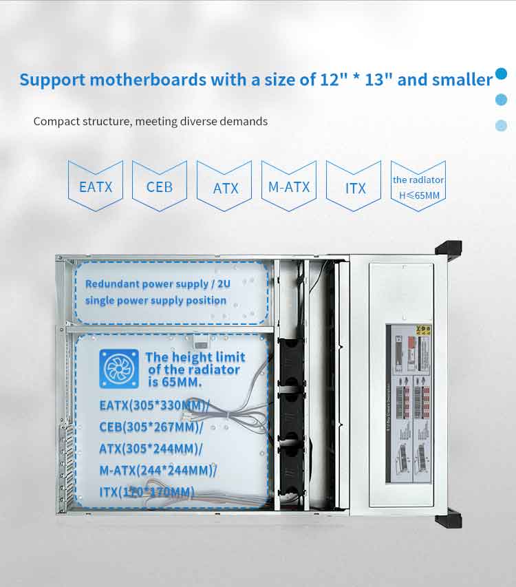 | Suitable Motherboard | EATX(12"*13")/CEB(12"*10.5")/ATX(12"*9.6")/Micro ATX(9.6"*9.6")/Mini-ITX(6.7"*6.7") |
