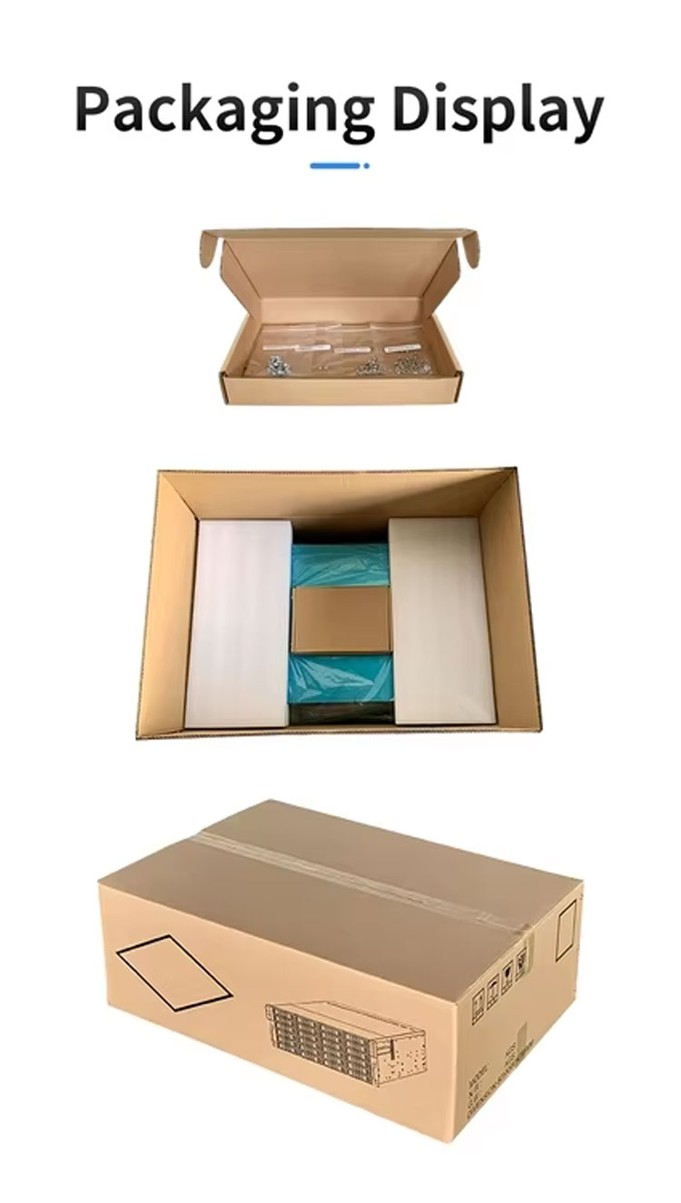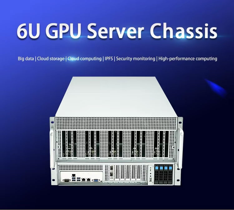 This rackmount GPU server chassis features a silver design with premium materials including 1.0mm SECC, aluminum alloy, and plastic. It supports EATX, CEB, ATX, and Micro ATX motherboards, and offers 8 half-height PCIe expansion slots. Equipped with 6pcs 12038 intelligent-temperature control fans and a 6Gb/s SAS backplane with SGPIO support, it ensures efficient cooling and reliable performance. The package includes carton with PE foam for secure transport.