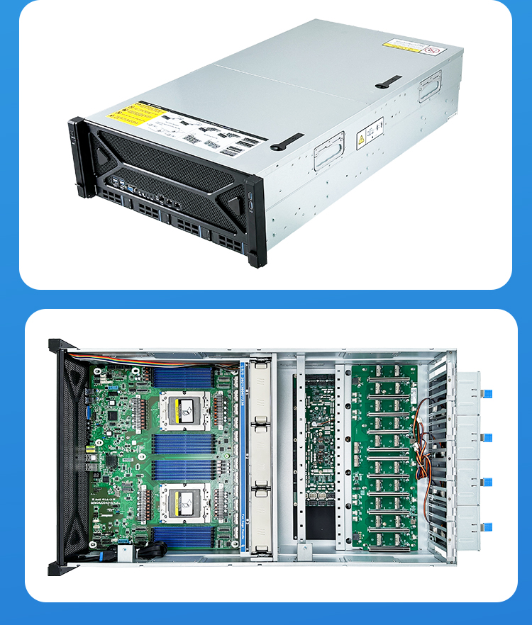 This high-quality 4U aluminium GPU server chassis is designed for gaming, AI rendering, and deep case rack-mounting. It features a sleek silver design with durable materials including 1.0mm SGCC, aluminum alloy, and steel. The chassis supports eight blower-style graphics cards, intelligent temperature control with 3pcs 12038 fans and 4pcs 8038 fans, and is compatible with ROME2D32GM-2T and GENOA2D24G-2L+ motherboards. It also includes 4*3.5″/2.5″ hot-swap U.2/SAS/SATA drive bays and an NVMe direct-connect backplane.