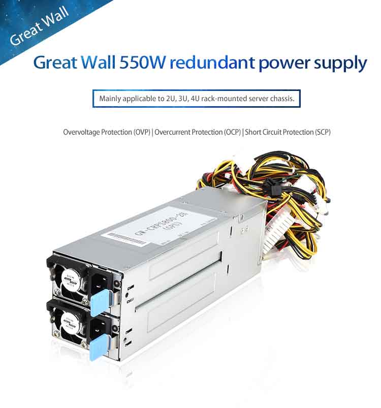 The Great Wall GW-CRPS550N2 AC-DC server power supply delivers 550W output power with a compact design (L225mm*W77mm*H84mm), supporting universal input voltage (100-240V). It is certified with CE, RoHS, UL, and more, ensuring compliance with global safety standards and enabling market access. Backed by a 3-year warranty for reliable performance in server applications.