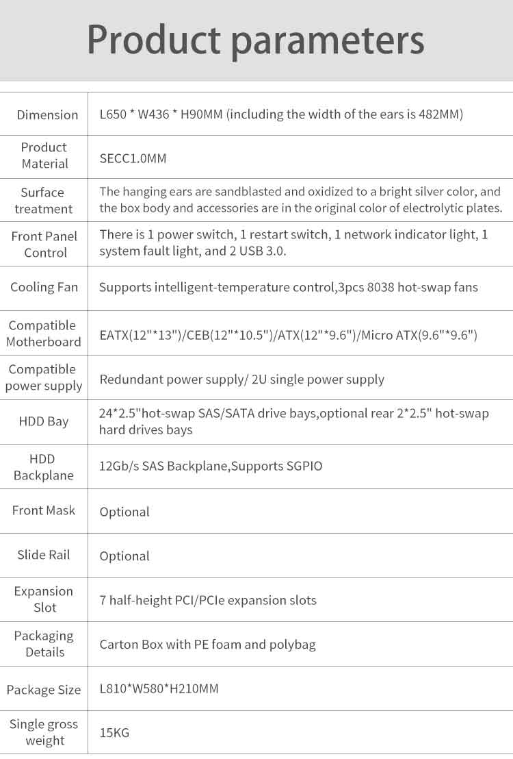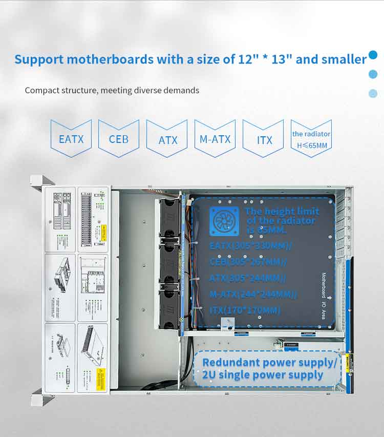 | Suitable Motherboard | EATX(12"*13")/CEB(12"*10.5")/ATX(12"*9.6")/Micro ATX(9.6"*9.6")/Mini-ITX(6.7"*6.7") |