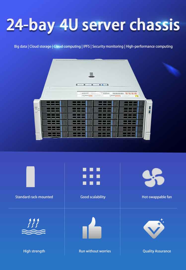 This 4U Rackmount Server Chassis features 24 hot-swap SAS/SATA/U.2 drive bays, and supports EATX, ATX, and Micro ATX motherboards. It includes intelligent-temperature control cooling with 3 hot-swap fans, 7 full-height PCIe expansion slots, and a durable build using Quality 1.0mm SGCC, Aluminum Alloy, and Plastic.