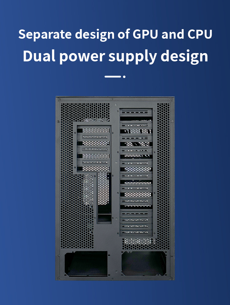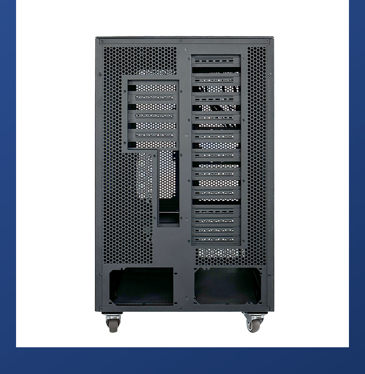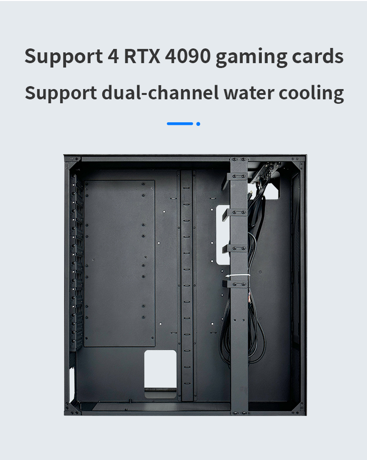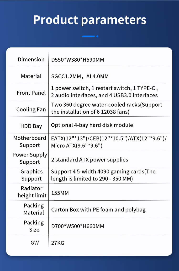 | Cooling Fan | 6 12038 fan positions on the front panel, 6 12038 fan positions on the top, 2 9225 fan positions can be installed on the rear window, supports 2*360 water cooling radiators |